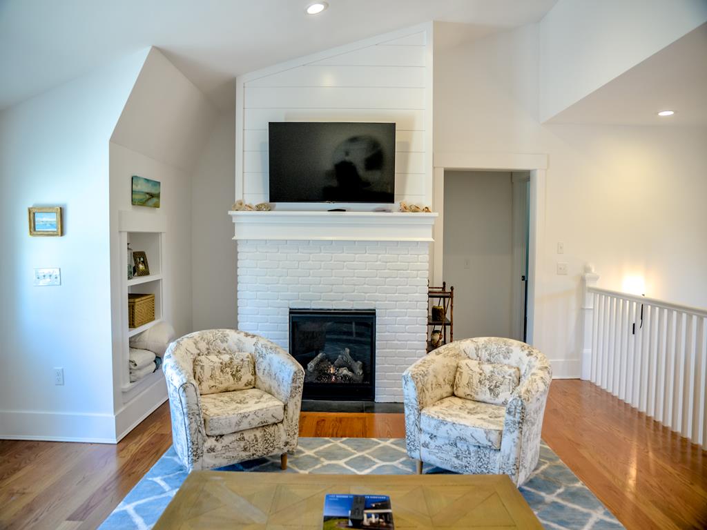 An open staircase leads to two additional bedroom suites that are separated by a family TV room. This area includes a small workspace, gas fireplace, and a balcony with chairs that overlook the pool area.