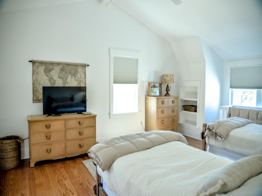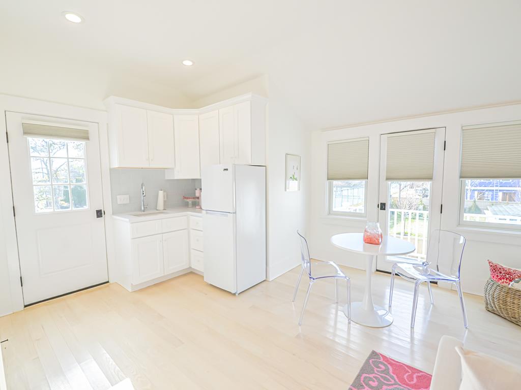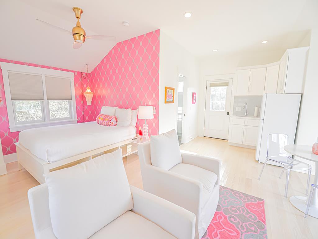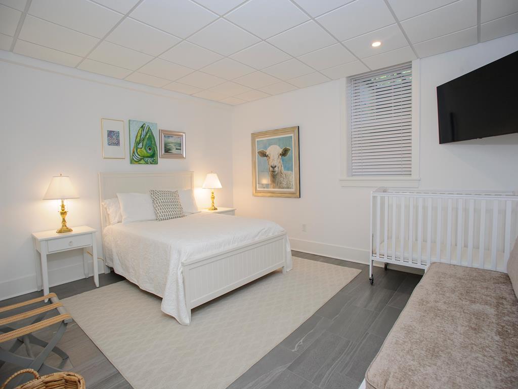 The brightly colored detached carriage house has a queen bed and a full bath with walk-in shower. There is a sitting area with TV and a small kitchen with a refrigerator, sink, and cabinet space (no stove). This is an ideal spot for extended family.
