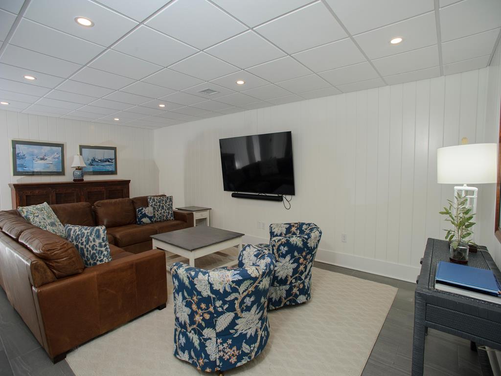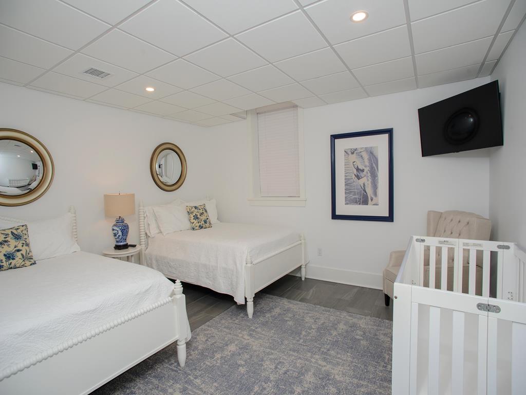 The lower level of this home has another living area with a TV, large sectional seating, and two additional sleeping areas that share a full bathroom.