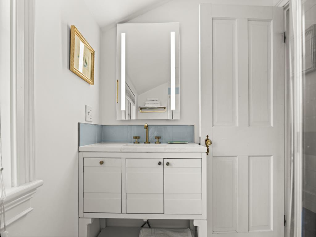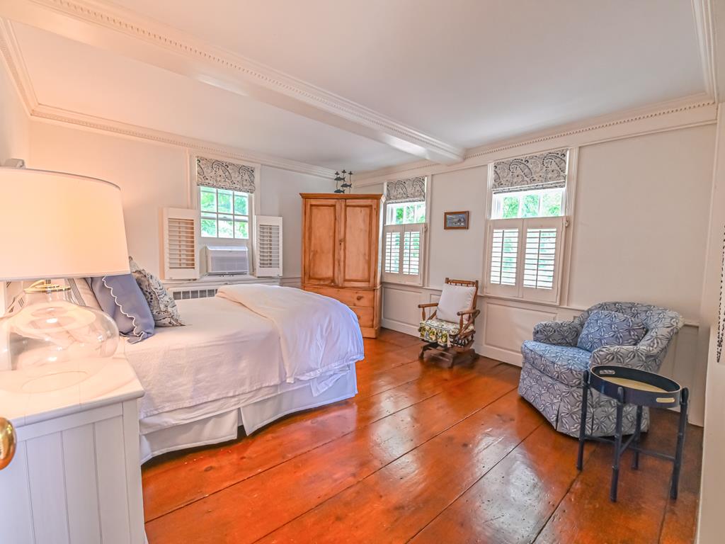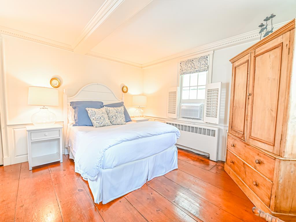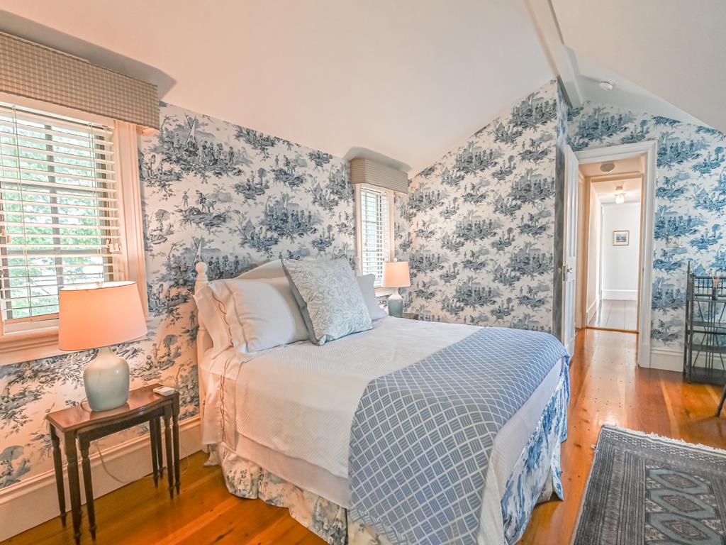 The primary bedroom is located on the third floor of the home and features a queen bed, walk in closet, TV, and sitting area. The bathroom has a double sink, soaking tub and walk in shower. Abundant natural light and classic charm fill the space.