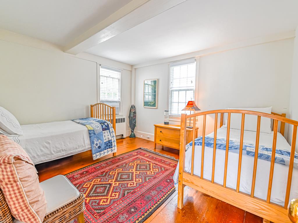 This charming home, featured as the Amity Island Police Station in the movie Jaws, boasts a modern kitchen with a six-burner gas stove, a wine fridge, and a counter seating for five. The inviting family room includes a TV and built-in window seating, while the dining area comfortably accommodates eight guests.